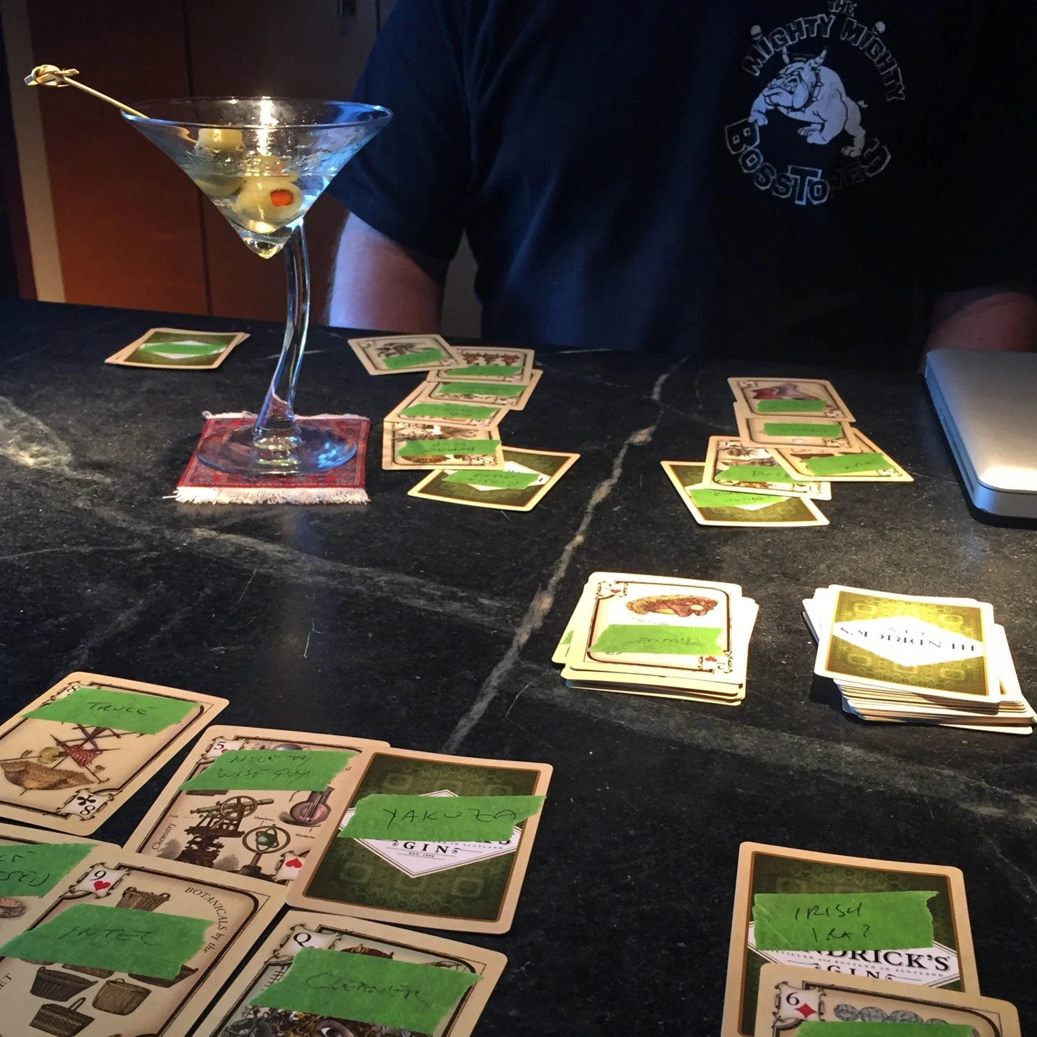 On this particular day, the martini in question was served up with three olives and a deck of Hendrick’s Gin playing cards — a souvenir from an adventure we had had aboard their blimp, The Flying Cucumber. On each of the playing cards was a piece of green masking tape with words like Poison, Double-crossed, and Whacked, written on it.